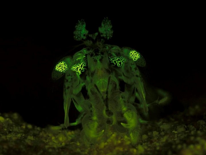 Lysiosquillina glabriuscula photographed in blue light with a yellow filter. Pigments in the “yellow” spots fluoresce yellow-green in blue light. As the animal goes deeper, the species specific signal remains yellow-green. Receptors in the eye are tuned to yellow-green.