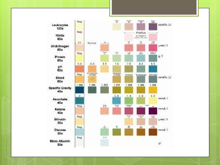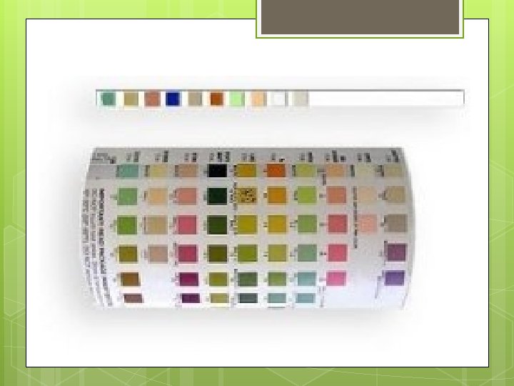 Sources of error § § § § § Incorrect dipping of reagent strip. Incomplete wetting of strip. Incorrect storage of strips – always check manufacturers instructions. Sample error – sample must be allowed to return to room temperature, non sterile containers; sample needs to be fresh for best results. Contamination of the reagant pad by handling or non sterile container. p. H may be falsely elevated if the urine is stale. Some medication can affect some of the reagents on the strips (e. g. cephalosporins; L-dopa; high levels of salicylates; chlorhexadine; ferrous sulphate) Strips out of date. Vegetarians may have a urine p. H >8.