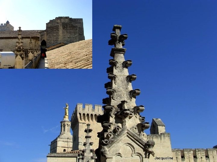 «Ils montèrent vers cet A majuscule d'Avignon qu'est le Palais des Papes; leur regard cherchai la fin des formidables verticales, se perdant dans le ciel. . . » -Elsa Triolet-