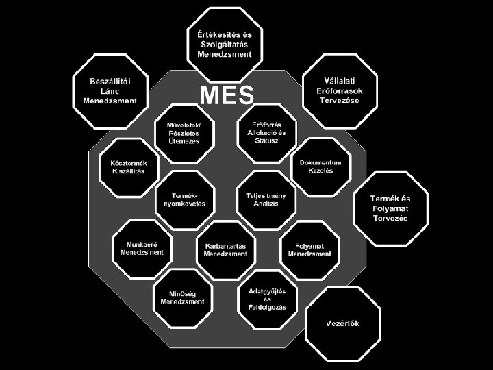 MES funkciók (Manufacturing Enterprise Solutions Assotiation, MESA) 1. Erőforrások allokálása 2. Finomprogramozás 3. Termelési egységek irányítása 4. Specifikációk kezelése 5. Üzemi adatbázis kezelés, adatgyűjtés 6. Munkaerő menedzsment 7. Minőségmenedzsment 8. Folyamat menedzsment 9. Karbantartás menedzsment 10. Termékkövetés 11. Teljesítmény analízis 12. Anyagkezelés