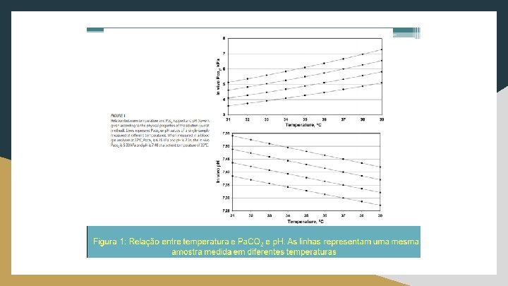 ● ● ● A maioria dos instrumentos de gasometria são ajustados para uma temperatura controlada específica de 37 o. C. Lei de Henry: a solubilidade de um gás dentro de um líquido diminui quando se diminui a temperatura. Durante a hipotermia, a Pa. CO 2 arterial diminui e o p. H aumenta em comparação com a temperatura de 37 °C, quando as medidas são feitas com a temperatura corporal real (Veja a Figura a seguir!) Em RN saudáveis com uma temperatura corporal de 37° C, p. H e Pa. CO 2 devem se aproximar de 7. 4 e 40 mm. Hg, respectivamente. Durante a hipotermia (33°C), p. H se elevará a 7. 5 e Pa. CO 2 baixará para 34 mm. Hg.