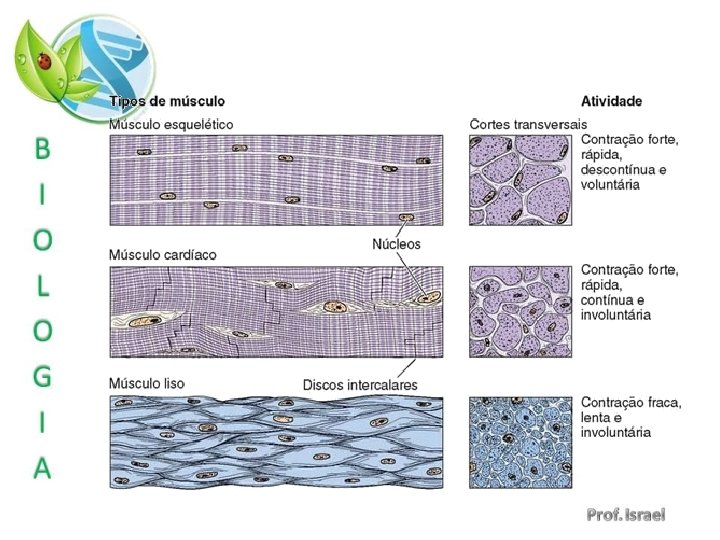 Tecido muscular - - - As células são caracterizadas pelo seu formato alongado é a função de contração e distensão. Existem cerca de 600 músculos no corpo humano. Os músculos são capazes de se contrair e relaxar, gerando movimentos que nos permitem andar, correr, saltar, nadar, escrever, impulsionar o alimento no tubo digestório, promover a circulação do sangue no organismo, urinar, defecar, piscar os olhos, rir, respirar… Há três tipos de tecido musculares: a) Tecido muscular liso; b) Tecido muscular estriado esquelético; c) Tecido muscular estriado cardíaco.