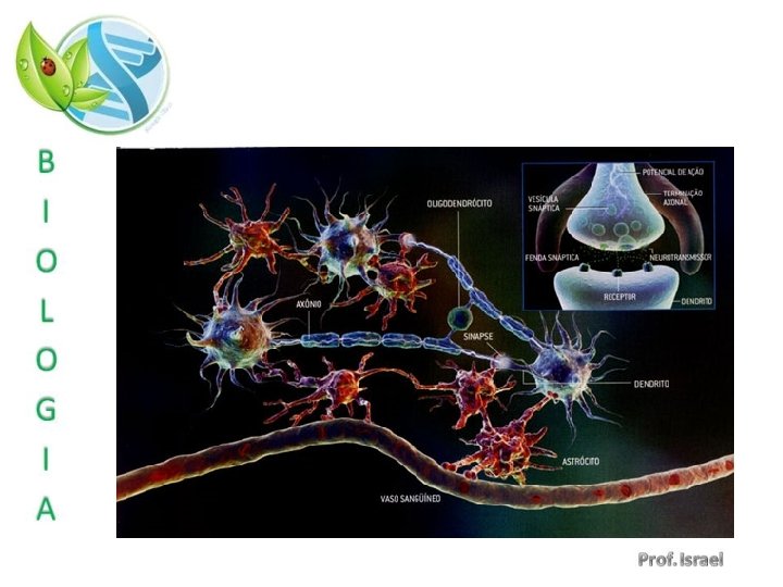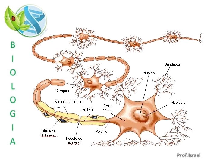 Neurônio • Formados por um corpo celular e numerosos prolongamentos. a) Corpo celular: é a parte onde ficam o núcleo e diversas organelas, como mitocôndria. b) Dendritos: prolongamentos bastante ramificados que têm a função de captar estímulos. c) Axônio: é um prolongamento maior, com ramificações em sua porção final. Sua estrutura é especializada para transmitir os impulsos nervosos para outros neurônios.