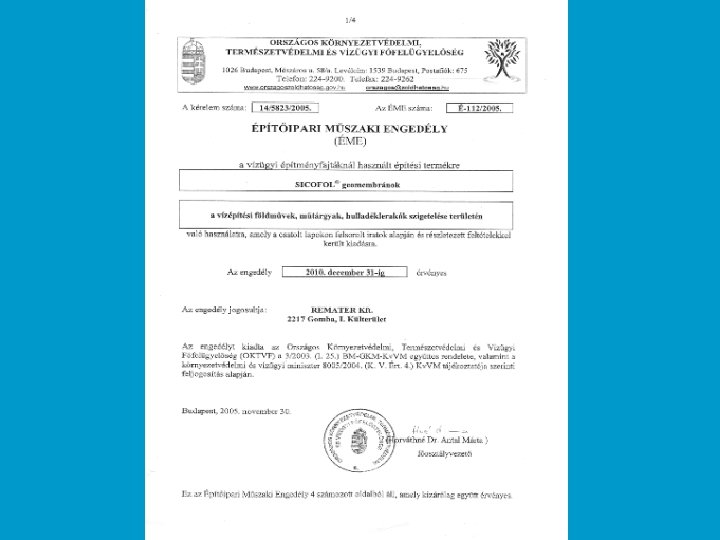 • Tószigetelés: Bp, Milleneumi Park dísztó, 2001, 2000 m 2 (S 1, 2 mm és 1 mm-es szigetelő lemez geotextília között) Bp-i Állatkertben a Japánkert, 900 m 2 (S 1, 5 mm) Alcsútdobozi golfpálya fürdőtava, 1996, 3000 m 2 (S 1, 2 mm) • Hígtrágyatározó: Balatonszabadi 2003, újépítésű földmedencés trágyatározó szigetelése (S 1, 5 mm-es lemezzel) Heves 2003, használt betonmedence utólagos szigetelése (S 1, 5 mm-es lemezzel) • Öntözővíztározó: Csurgó 2002, 5000 m 2 -es szigetelése (S 1, 5 mm-es lemezzel)