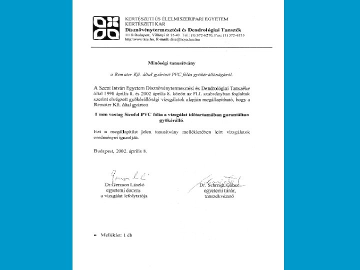 • Kavicsterhelésű lapostető: Balassagyarmat, társasház, 1999, 800 m 2 (S 1, 5 mm és 1 mm-es védőréteg) • Zöldtető: Budapest, Erzsébet telefonközpont, 1994, 1250 m 2 (S 1 mm-es gyökérvédőréteg) Budapest XIV. Hermina úti Gimnázium, 1997, 600 m 2 (S 1, 5 mm és 1 mm-es félkemény védőréteg) Prága, Kereskedelmi Központ, 2000, 800 m 2 (S 1, 5 mm és 1 mm-es védőréteg) • Nádgyökérteres szennyvíztisztító szigetelése: Kám, 1999, 5000 m 2 (S 1, 5 mm-es szigetelő lemez) Kerecsend, Gombaipari Egyesülés, 2000, 1500 m 2 (S 1, 5 mm-es szigetelő lemez üvegfátylas védőréteggel)
