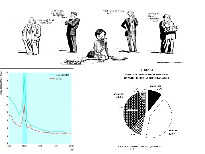The Famine • What factors contributed to the famine of 1959 -62? • “Encouraged by expectations of a great leap in agricultural productivity from collectivization, the government diverted massive amounts of agricultural resources to industry and sharply raised grain procurement from the peasants, eventually leading to malnutrition among peasants and decimation of their labor productivity in growing next year's crops. The consecutive years of bad weather also aggravated the fatal economic policies. The decline in food availability was indeed a cause of the GLF famine. But other institutional factors, including urban bias in China's food distribution system, radical local policies, and grain exports, were also major contributors of the excess mortality. By and large, the GLF catastrophe was the result of a series of failures in central planning. ” • While the inflated numbers reported by communes contributed to the famine, what is more disturbing is that the top CCP officials knew it was happening, and yet continued to take large portions of the grain yields.
