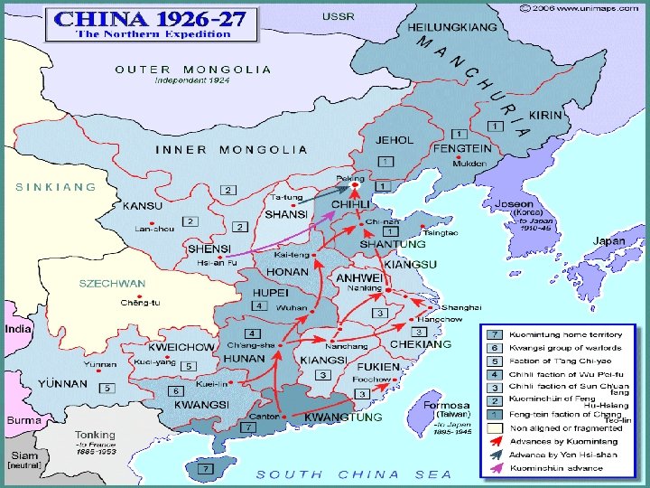 The Northern Expedition 1926 -1928 • The attack on the warlords began in 1926, in a combined operation amongst the KMT and CCP. • Peasants & workers welcomed Chiang’s armies & there was little resistance from the warlords. • China was now reunified and Chiang’s government was recognised by foreign powers.