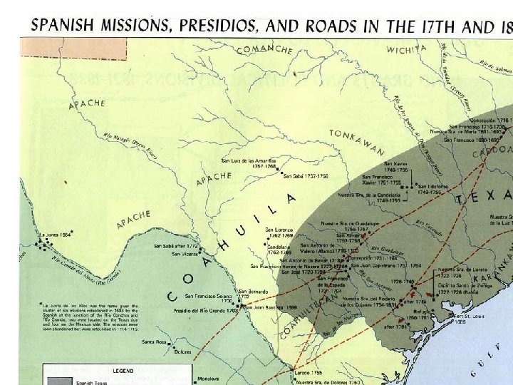 Key 1 st Ysleta Tejas Mission ½ San Juan Bautista Valero (Alamo) San Jose La Bahia 1 st San Saba Mission Saba River Neches River ½ Guadalupe River San Antonio River Rio Grande