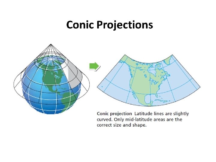 Projection Properties According to properties map projections can be classified as: • Equal area projection: Also known as homolographic projections. The areas of different parts of earth are correctly represented by such projections. • True shape projection: Also known as orthomorphic projections. The shapes of different parts of earth are correctly represented on these projections. • True scale or equidistant projections: Projections that maintain correct scale are called true scale projections. However, no projection can maintain the correct scale throughout. Correct scale can only be maintained along some parallel or meridian.