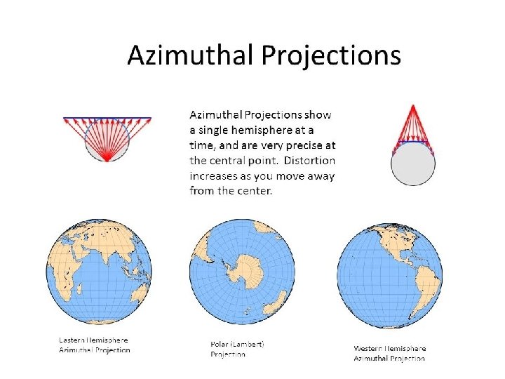 Maps that preserve direction On any Azimuthal projection, all azimuths, or directions, are true from a single specified point to all other points on the map. On a conformal projection, directions are locally true, but are distorted with distance.