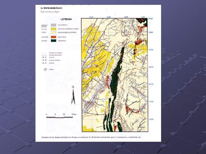 MAPAS GEOLÓGICOS Son los requisitos más importantes en la geología y minería. La idea principal de un mapa geológico es la representación de una situación geológica en un mapa. Es decir se dibujan arriba de una carta topográfica modificada en color o con simbología la litología. Cada estrato, unidad o formación con su propio color o símbolo. Los Mapas geológicos permiten una interpretación rápida de un sector de interés. Para confeccionar un mapa se trabajan en varias etapas: Etapas de un proyecto de mapeo geológico: Etapa Mapa detallada Mapa regional 1 Estudio de Antecedentes 2 Análisis de fotos aéreas 3 Estratigrafía 4 Topografía en detalle 5 Estratigrafía (en terreno) Perfil litológico Definición de unidades del mapeo Mapeo en terreno 6 Mapeo litológico Verificación con fotos aéreas Levantamiento estructural 7 Dibujo del mapa 8 Confección de perfiles 9 Informe con descripciones detalladas