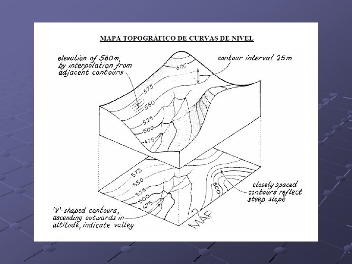 CARACTERÍSTICAS DE LAS CURVAS DE NIVEL En términos generales si en un mapa topográfico las curvas de nivel aparecen bastante separadas unas de otras esto significa que el terreno que representa es de pendiente suave. En cambio cuando aparecen muy próximas unas de otras, representan un terreno muy quebrado (pendiente fuerte). Las curvas de nivel al hacer contacto con la hidrografía, una quebrada, un río, etc. Forman una “V” cuyo vértice indica la dirección de donde vienen las aguas es decir, la parte mas alta del terreno. Las curvas de nivel se cierran sobre si mismas dentro o fuera del mapa y nunca se cruzan, aunque aparecen muy juntas a veces superpuestas en riscos, fallas o paredes mas o menos verticales. La equidistancia o separación entre curvas de nivel depende de la escala del mapa y de la importancia del relieve. Las curvas de nivel no pueden cortarse Las curvas de nivel cerradas indican una prominencia o una depresión del terreno.
