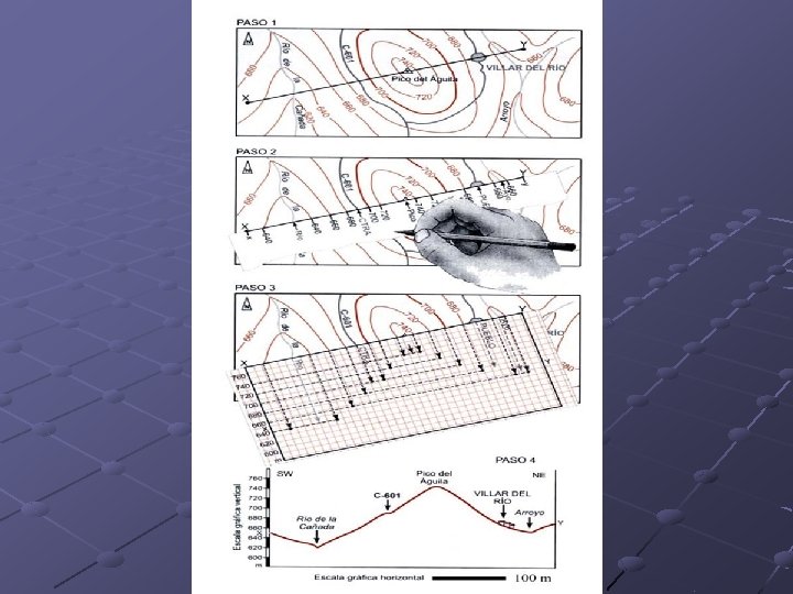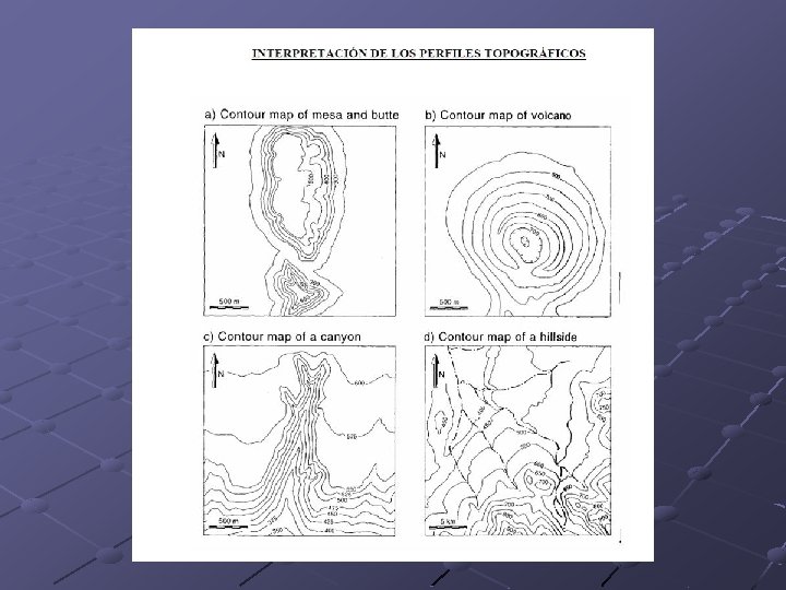 PLANOS TOPOGRÁFICOS CURVAS DE NIVEL: son líneas imaginarias del terreno, las que dibujadas en los mapas unen puntos de igual altura ( Isolineas) con respecto a un plano de referencia, que generalmente es el nivel del mar. PERFIL TOPOGRÁFICO: intersección de un plano vertical o en cualquiera dirección con la superficie del terreno