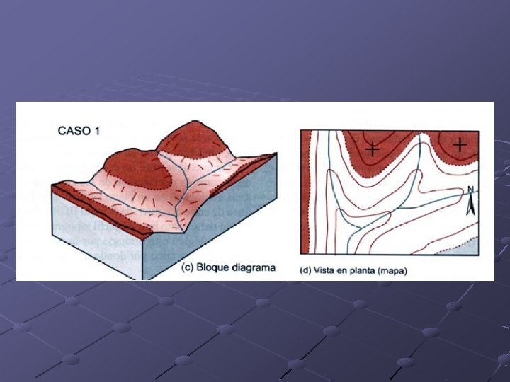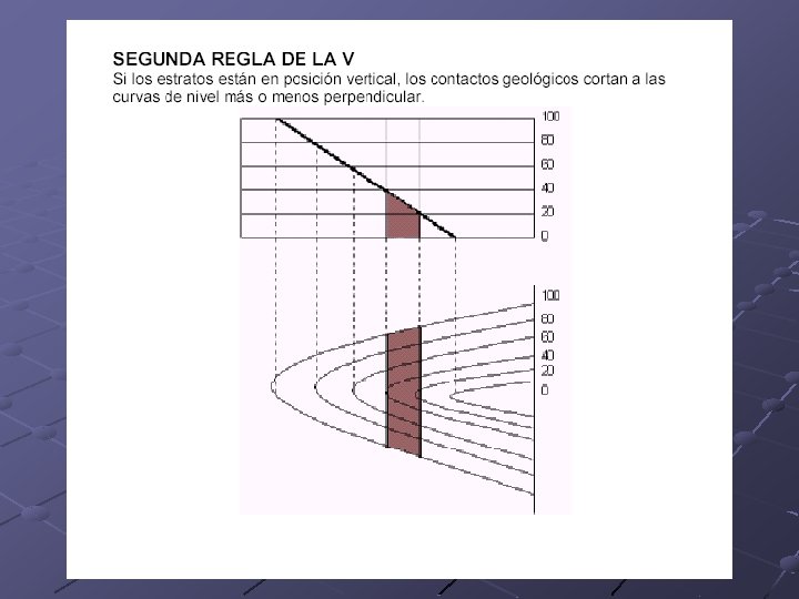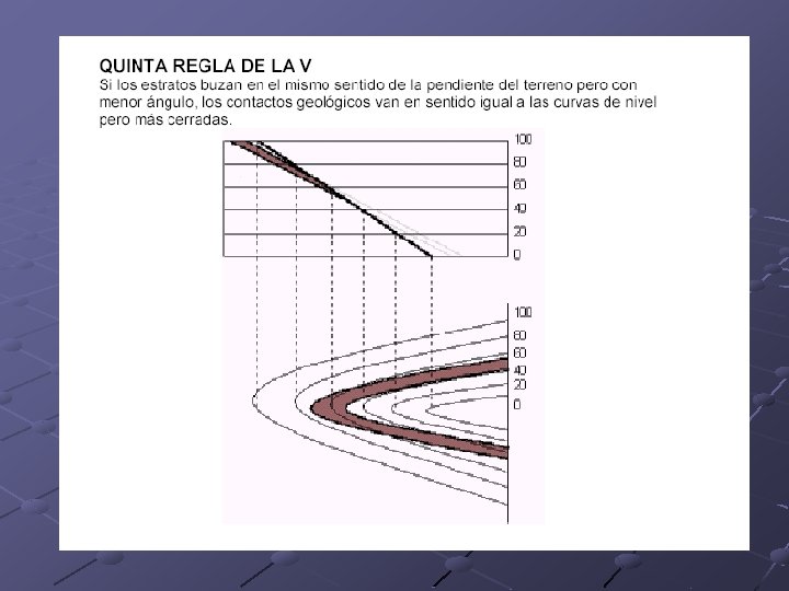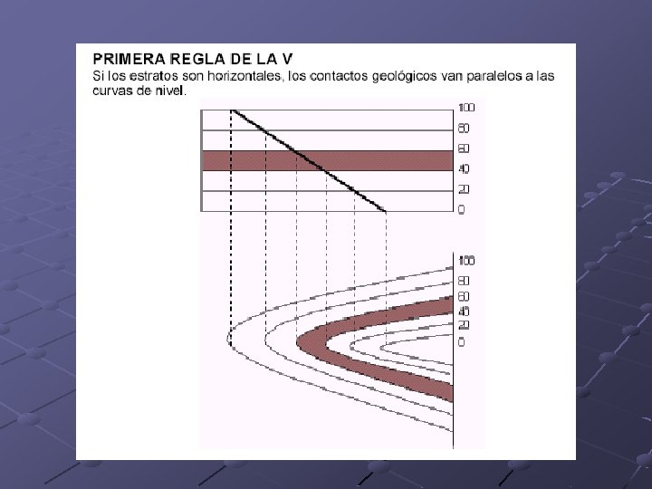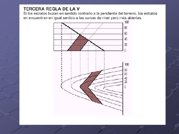LEYES DE LAS “UVE” Es Las relaciones entre buzamiento de los estratos o capas y topografía o relieve del terreno se han formalizado en una serie de reglas, llamadas conjuntamente Regla de la V, por las cuales se puede estimar directamente la dirección de buzamiento de los planos estructurales a partir del modelo de afloramiento.