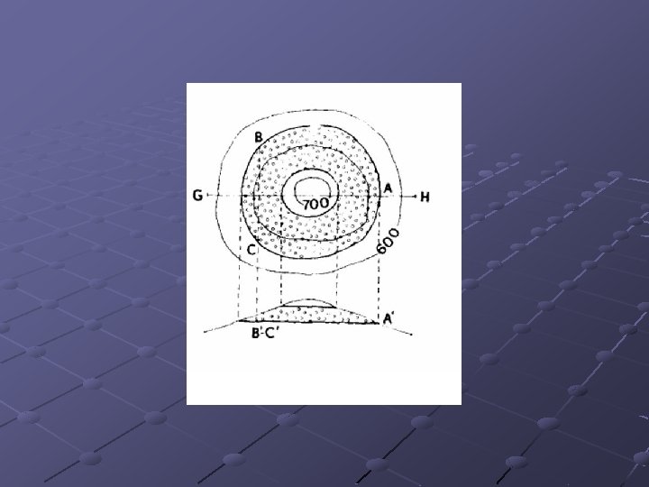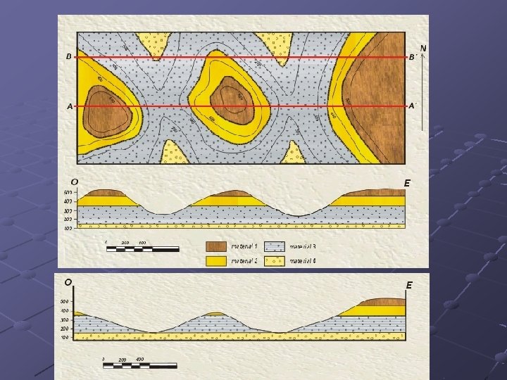Capas verticales En este ejemplo de abajo se ha utilizado el mapa geológico anterior incluyendo una capa vertical que atraviesa varios de los materiales presentes. Como se puede observar en el mapa geológico, la traza de la capa vertical es rectilínea y no le afecta la presencia de curvas de nivel. Así mismo es importante resaltar que en el corte A-A´, la capa no es cortada en superficie por el perfil, pero podemos inferir su presencia por debajo de los materiales 1 y 2.