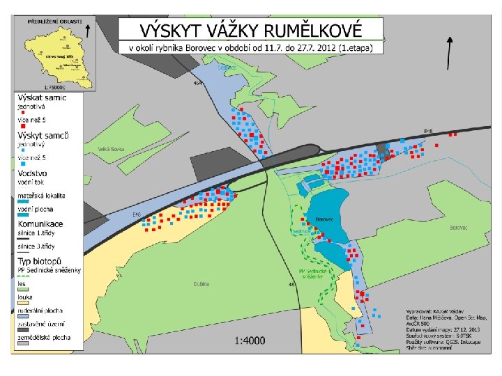 Úvod do problematiky • Mapování vážky rumělkové, • sběr dat u rybníku Borovec v Příboře, • dostupná data z roků 2012, 2013, • cca 1000 záznamů. Rozšíření vážky rumělkové Autor: Martin Waldhauser