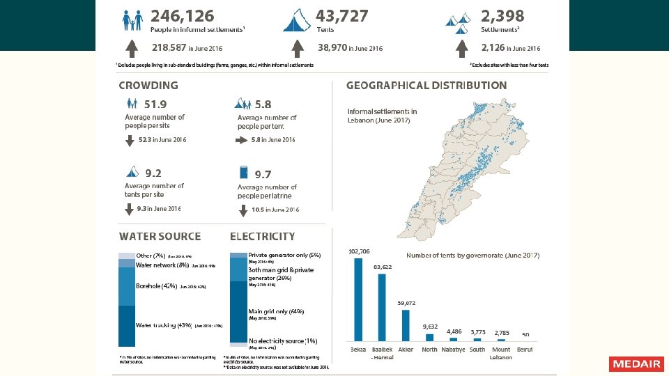 IAMP Update • Nationally 23. 26% of Registered Syrian Changes between IAMP 24 and IAMP 34 13. 61% Increase in Number of Settlements. Population lives in Informal Settlements* – 65. 77% in the Bekaa – 26. 36% in the North – 5. 08% in the South – 2. 79% in Beirut/Mt. Lebanon • 236, 662 Individuals 19. 71% Increase in Number of Tents. . 19. 1% Increase in Number of Individuals. . • 41, 613 Tents • 4, 373 Settlements *Based off number of registered Syrian population as of 30 Sep 2016 and IAMP 34 Inter Agency Mapping Platform