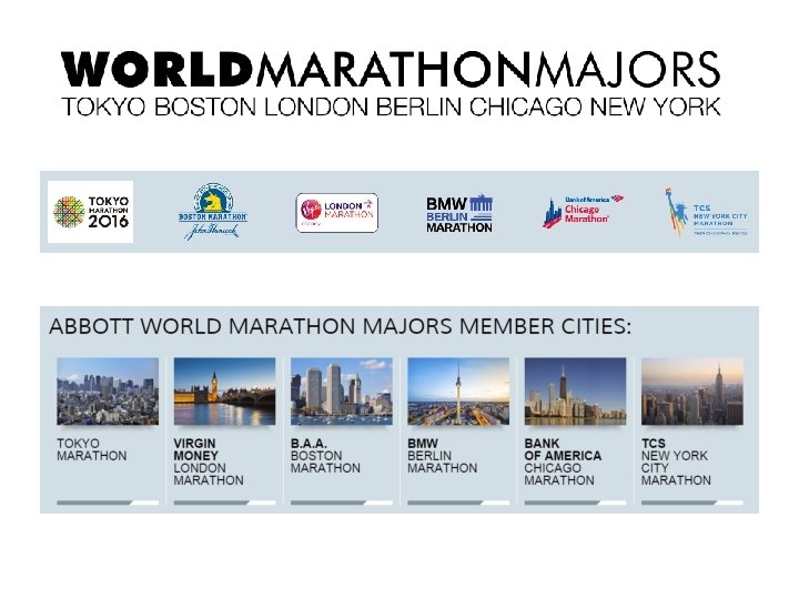 • 2006 gründeten die fünf weltgrößten Marathonveranstaltungen die Laufserie World Marathon Majors. Sie umfasste zunächst den Berlin-Marathon, den Boston-Marathon, den London-Marathon, den Chicago-Marathon und den New-York-City-Marathon. Später (2013) wurde noch der Tokio-Marathon als sechste Veranstaltung in die Serie aufgenommen. • Die Serie läuft jeweils über zwei Jahre und ist mit je 500. 000 US-Dollar für den besten Mann und die beste Frau dotiert.
