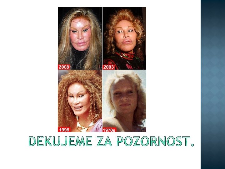� Zlepšování dovedností a znalostí �Reparace rozdrcených čelistí, uříznutých nosů, řezných ran v obličeji, …. � 1946 Gillies – 1. operace, při níž přeoperoval ženu na muže � 1962 Thomas Cronin - 1. implantáty vyrobené ze silikonu �V následujících deseti let se silikon používal k vylepšení snad každé části těla.