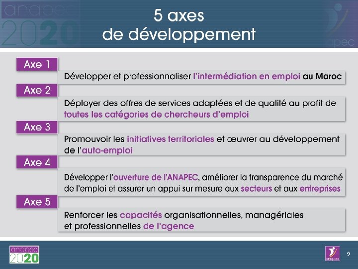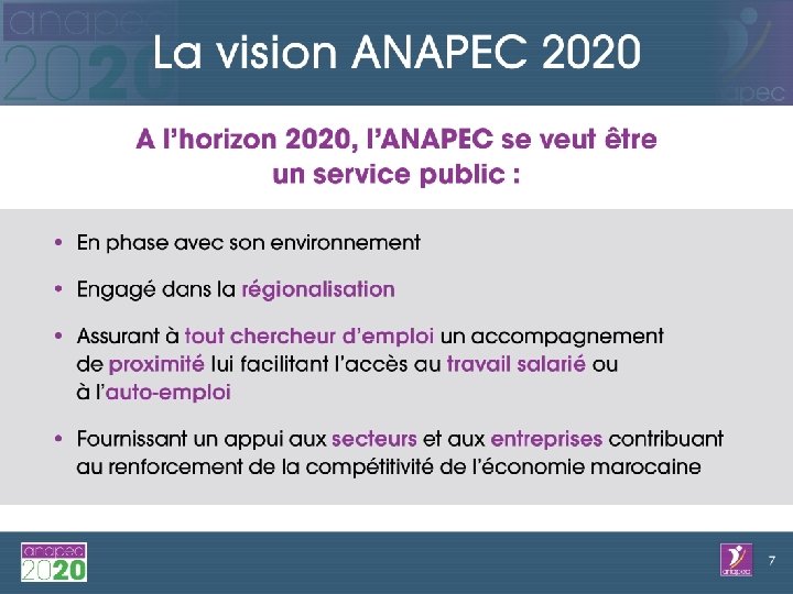 L’ANAPEC aujourd’hui Chercheur d’emploi Porteur de projet » 1500 accompagnés à la création d’entreprise » 300 000 entrants reçus. » 70 000 entretiens de positionnement » 45 000 bénéficiaires d’ARE. » 77 agences » +600 cadres Employeur » 100 000 postes à pourvoir » 70 000 insertions