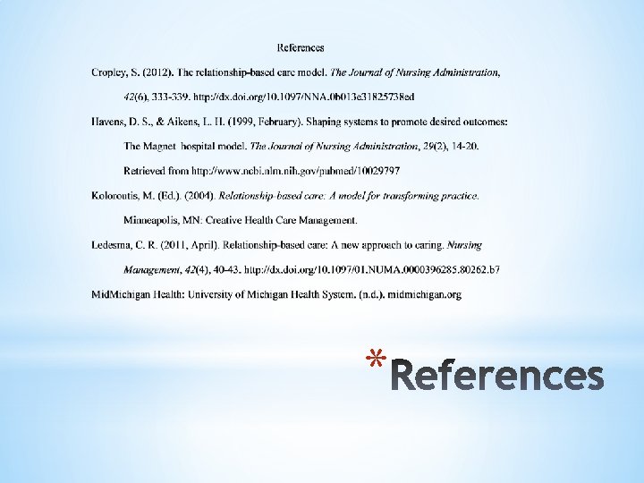 Leadership Outcomes Teamwork Patient and Familiy Professional Practice Resources Care Delivery (Koloroutis, 2004)(Winsett & Hauck, 2011) (Cropley, 2012) (Ledesma, 2011) *