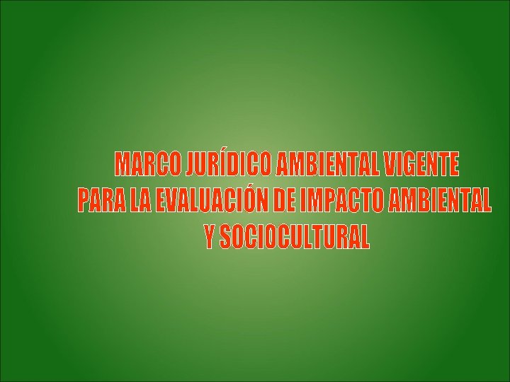 Marco Jurídico Ambiental Constitución de la República Bolivariana de Venezuela. Articulo N° 129 (Capítulo IX. Derechos Ambientales). “Todas las actividades susceptibles de generar daños a los ecosistemas deben ser previamente acompañadas de estudios de impacto ambiental y sociocultural. El Estado impedirá la entrada al país de desechos tóxicos y peligrosos, así como la fabricación y uso de armas nucleares, químicas y biológicas. Una ley especial regulará el uso, manejo, transporte y almacenamiento de las sustancias tóxicas y peligrosas. ”