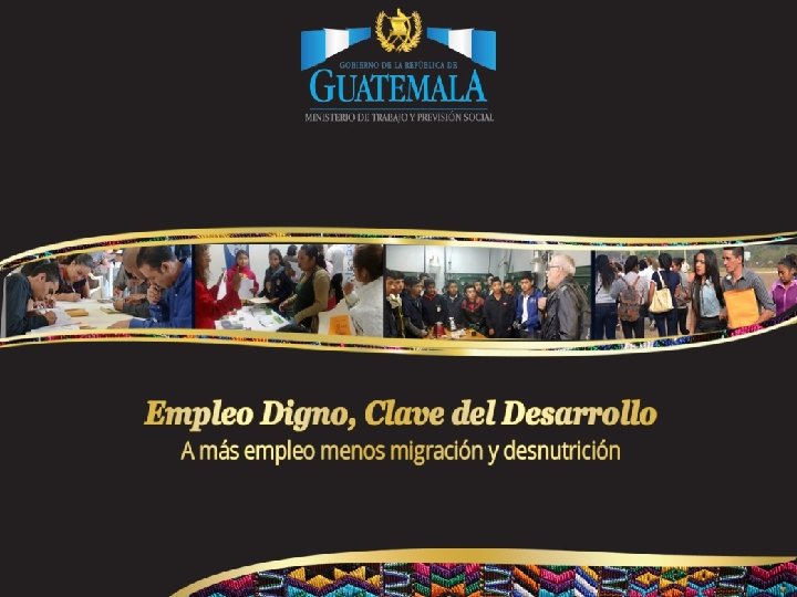 Situación actual del Mercado Laboral en Guatemala Población Total: 16, 721, 561 Población en Edad de Trabajar: 11, 184, 043 (66. 9%) Población Ocupada: 6, 645, 485 (97. 6%) Informalidad: 4, 507, 860 (67. 8%) Formalidad: 2, 137, 625 (32. 2%) Población Desocupada: 163, 473 (2. 4%)