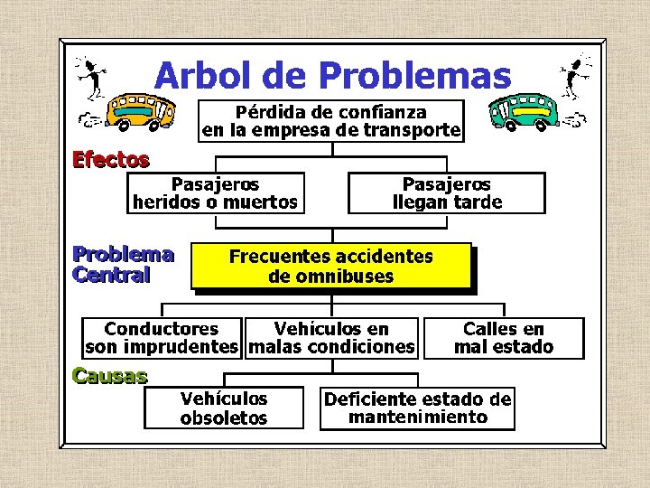 ARBOL DE PROBLEMAS z Se construye un esquema de relación en donde: 1. el problema principal se ubica en el centro (tronco) 2. las causas se ubican hacia abajo (raíces) 3. los efectos se ubican arriba (ramas) 4. se dibujan líneas de conexión entre unas y otras