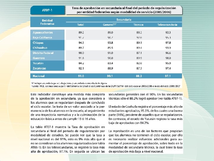 Temas relevantes en 2007 • Contexto Social • Escolaridad en el hogar de los niños • Avance educativo de la población • Situación laboral y escolar de los jóvenes • Asistencia escolar por tipo de localidad • Agentes y Recursos en el Sistema • Escuelas primarias multigrado • Telesecundarias unidocentes y bidocentes • Escuelas con computadoras e internet • Acceso y Trayectoria • Cobertura • Rezago y extraedad grave • Probabilidad de avance normativo • Resultados Educativos • Logro educativo • Población contratación estable