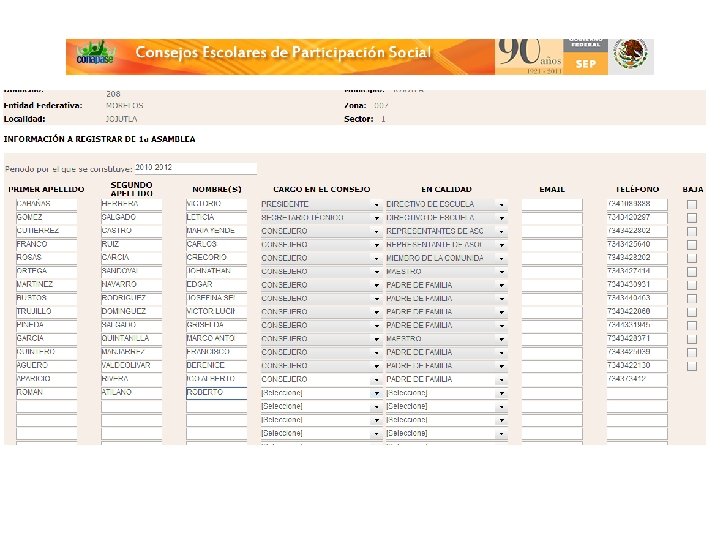 La Plataforma nos mostrará la información que tiene registrada del ciclo escolar anterior, en este caso, debemos seleccionar los consejeros que se darán de baja: En los reglones de abajo, se registrarán a los nuevos consejeros: