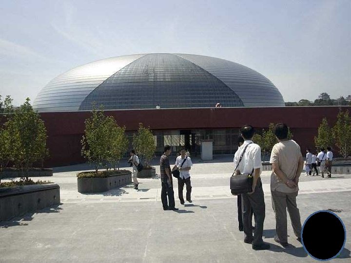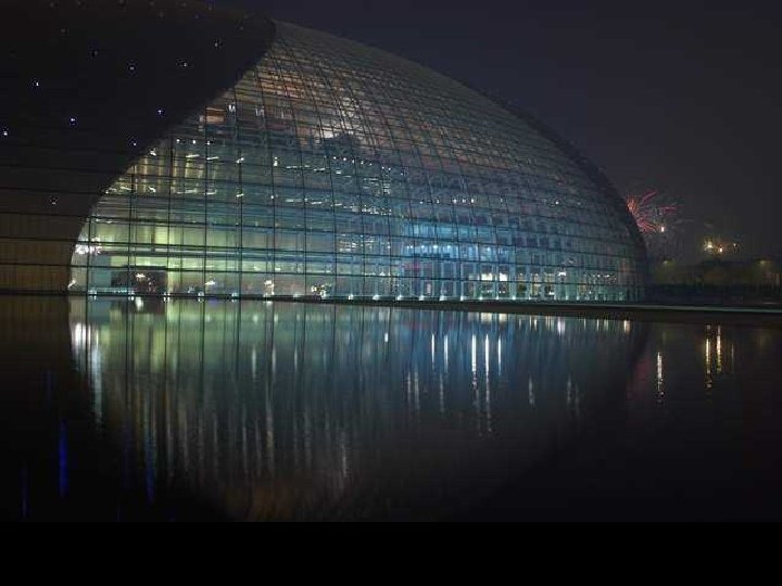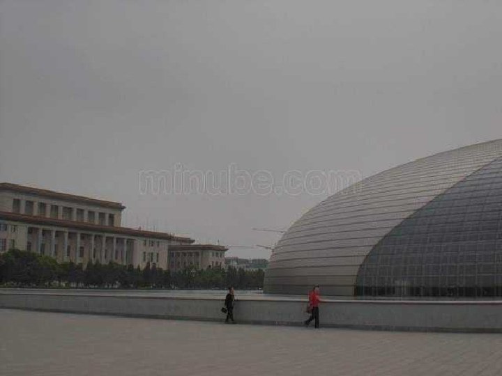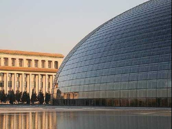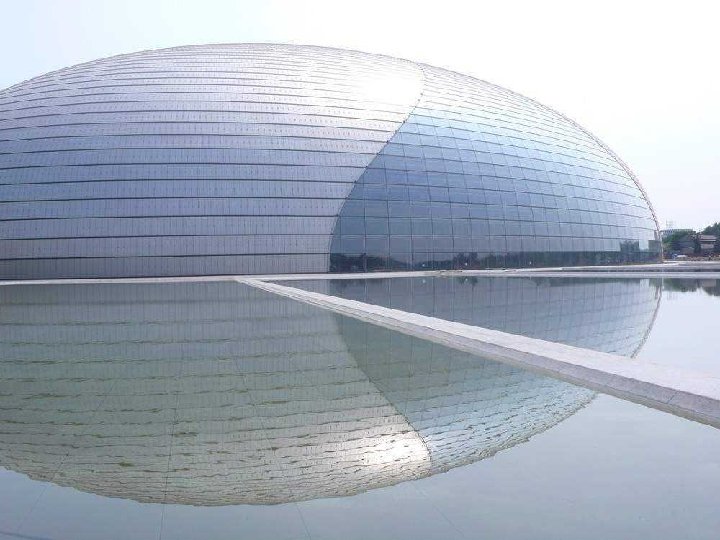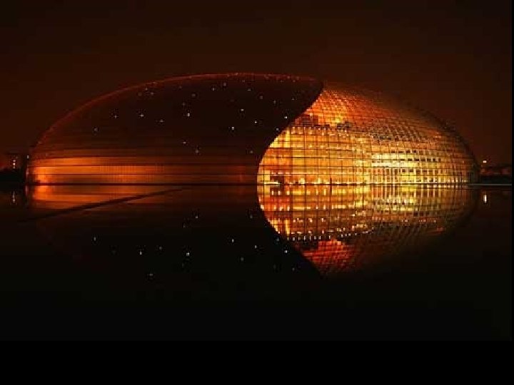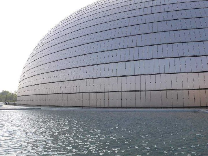 Clădirea are cupola din titan şi sticlă şi dimensiunile: 212 m lungime, 143 m lăţime şi 46 m înălţime, fiind înconjurată de o lagună artificială, accesul făcându-se printr-un tunel. Opera din Pekín, după cum o descrie arhitectul Andreu, este o perlă barocă pe apă. Sticla devine un voal, care permite ca trecătorii se poate vedea în interior. Pe de altă parte, titanul este materialul care acoperă zonele ce rămân ascunse. Odată ajunşi în cupolă, vizitatorii intră în trei zone principale: pentru operă, balet şi dans, plus un spaţiu pentru expoziţii. Paul Andreu este un arhitect de origine francză, născut în 1938 la Caudéran, Gironde, Franţa. Complexul are 21 de etaje, cu o sală pentru operă, una pentr concerte, precum şi două teatre. Are 52 de lifturi.