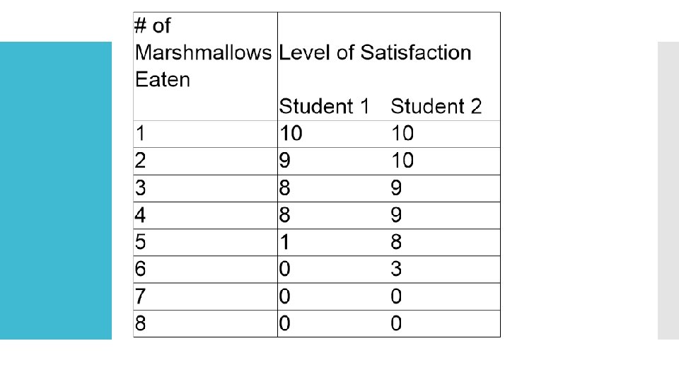 What happened to each student’s total satisfaction with each marshmallow purchased and eaten? So… Their total satisfaction increased with each one they bought. What happened to the additional satisfaction or marginal utility as more marshmallows were purchased and eaten? At some point, the additional satisfaction began to diminish with each additional marshmallow.