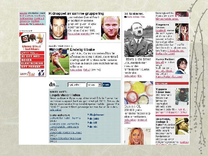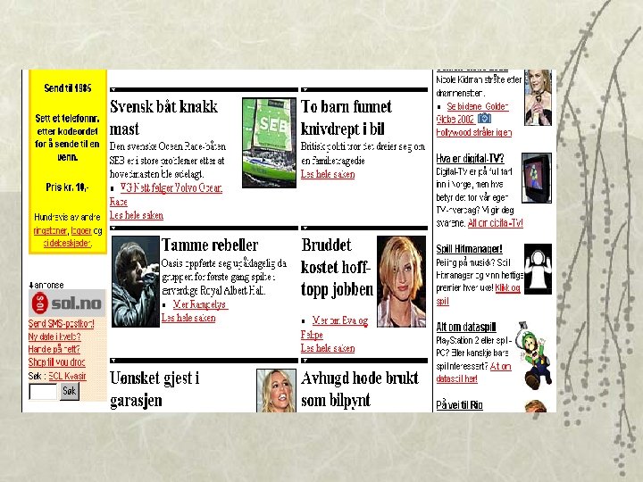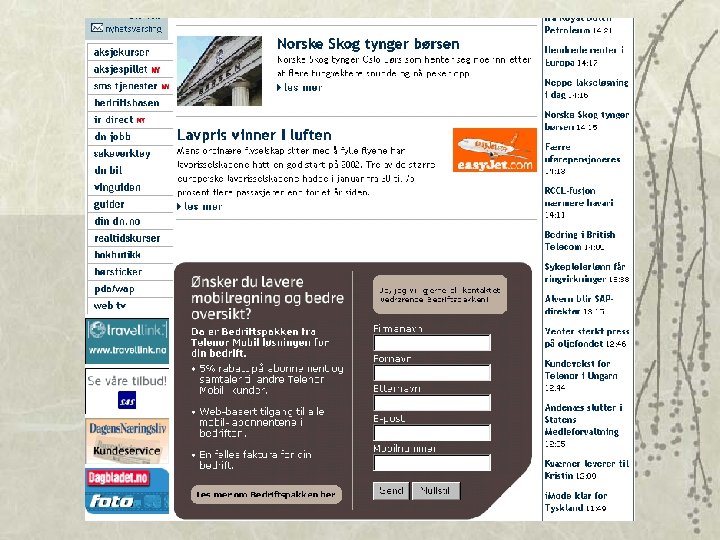 Eksempel på bruk av ”bannere”. v Vi velger å se på nettavisens sider. Vi kan oppservere at banners er brukt både for å markedsføre nettavisens sider, og solgt som reklameplass. v Det er brukt både bannere som opptrer på skjermen i en kort periode, og bannere som står fremme permanent v
