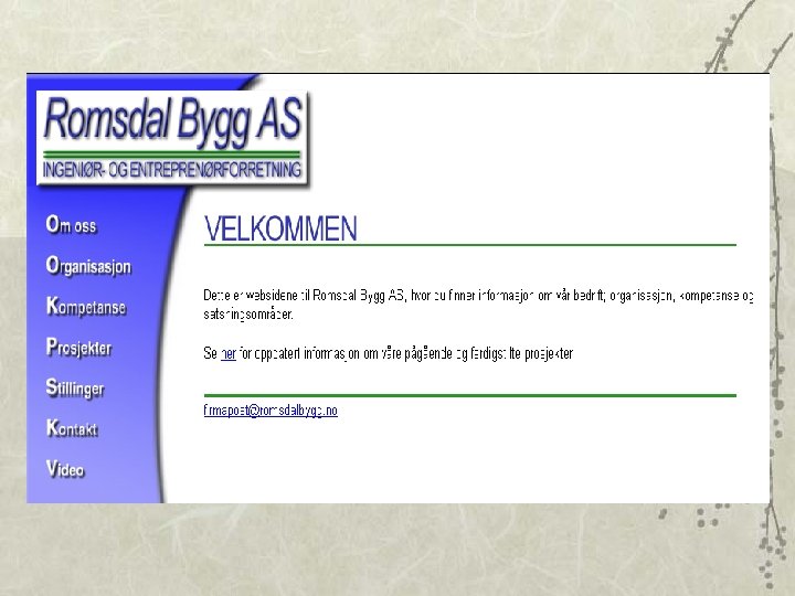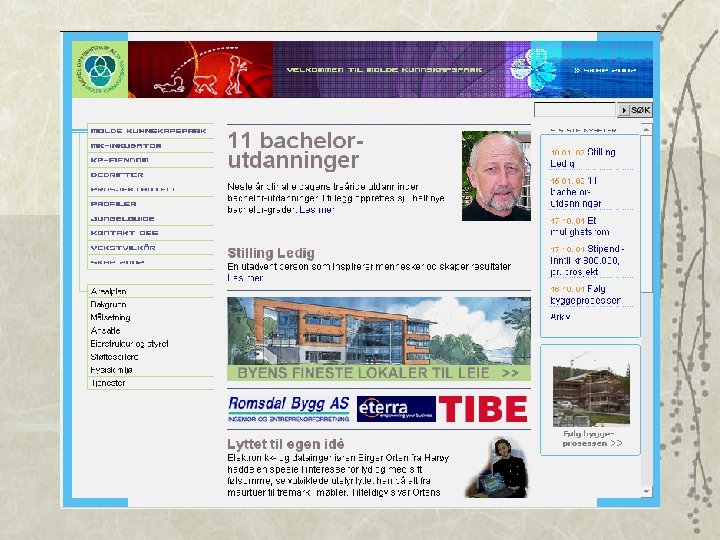 Litt om hovedsida. . v. Innholder ulike reklamer ”bannere”, som en kan klikke på for å få frem tilhørende nettside. v. Ulike linker til div informasjon om Kunnskapsparken. v. Også siste nyheter om div saker