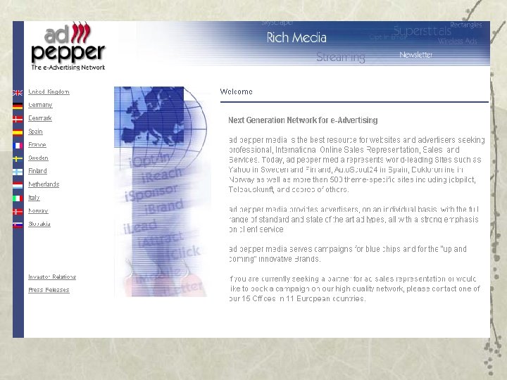 v. Selv om mange av websitene som representeres benytter seg av Ad. Force eller Dart, en av verdens ledende annonseringsløsninger, er tjenestene tilgjengelig for annonsører uavhengig av hvilken teknologi man velger å benytte. v. Dersom man planlegger en kampanje i Europa eller USA kan det raskt innhentes et detaljert tilbud som er ”skreddersydd” ditt språk, din valuta og andre stedsspesifikke betingelser, inkludert målsetninger og priser.