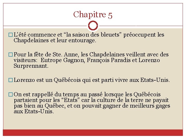 Chapitre 5 � L’été commence et “la saison des bleuets” préoccupent les Chapdelaines et leur entourage. � Pour la fête de Ste. Anne, les Chapdelaines veillent avec des visiteurs: Eutrope Gagnon, François Paradis et Lorenzo Surprennant. � Lorenzo est un Québécois qui est parti vivre aux Etats-Unis. � On est rappellé du temps au passé lorsque les Québécois partaient pour les “Etats” car la culture de la terre ne payait pas bien au Québec, et on pouvait gagner de meilleurs gages aux Etats-Unis.