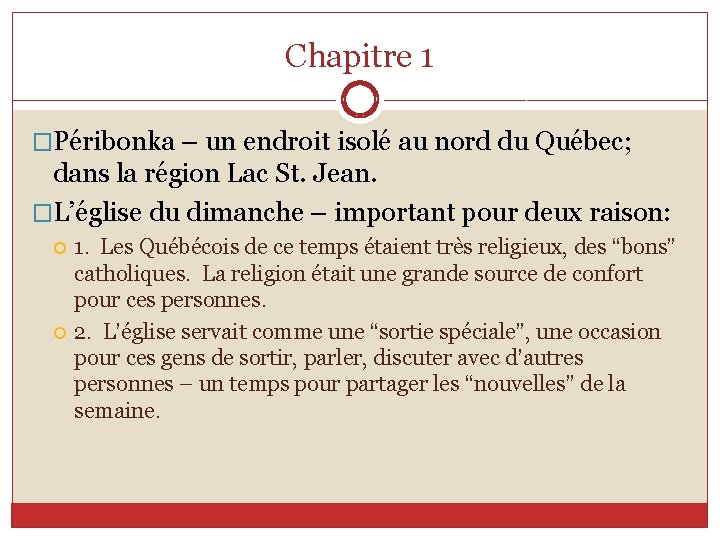 Chapitre 1 �Péribonka – un endroit isolé au nord du Québec; dans la région Lac St. Jean. �L’église du dimanche – important pour deux raison: 1. Les Québécois de ce temps étaient très religieux, des “bons” catholiques. La religion était une grande source de confort pour ces personnes. 2. L’église servait comme une “sortie spéciale”, une occasion pour ces gens de sortir, parler, discuter avec d’autres personnes – un temps pour partager les “nouvelles” de la semaine.