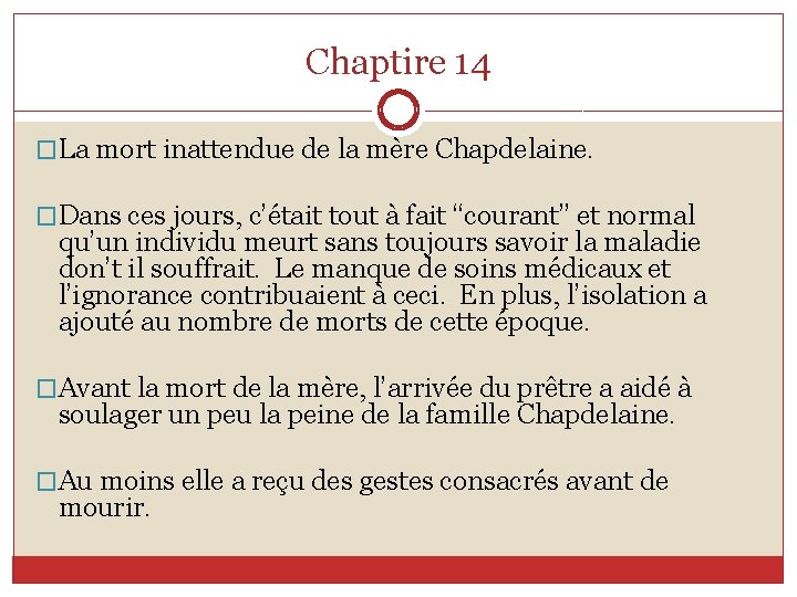Chaptire 14 �La mort inattendue de la mère Chapdelaine. �Dans ces jours, c’était tout à fait “courant” et normal qu’un individu meurt sans toujours savoir la maladie don’t il souffrait. Le manque de soins médicaux et l’ignorance contribuaient à ceci. En plus, l’isolation a ajouté au nombre de morts de cette époque. �Avant la mort de la mère, l’arrivée du prêtre a aidé à soulager un peu la peine de la famille Chapdelaine. �Au moins elle a reçu des gestes consacrés avant de mourir.