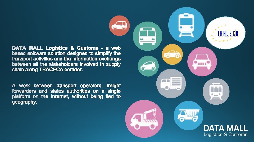 WHAT ISSUES DMLC IMPLEMENTATION WILL SOLVE? • Significantly decreasing the transit time delays by forming organized logistics chains. • Costs reduction with transport documents (issuing, forwarding transport documents to final beneficiaries, translations, etc. ) • Direct communication and efficient exchange of information between transport operators, freight forwarders and states authorities. • Informing of all the participants about the operations progress, including emergency situations. Notification will be sent both through the Web-resource and mobile devices. • Better transport services quality in terms of planning, time usage and overall increase of corridor competitiveness. • Real time monitoring of the transport flows and real time notifications for the needed resources • Consolidated information database available for stakeholders. • Big data analysis reports made on the database generated by the software solution.