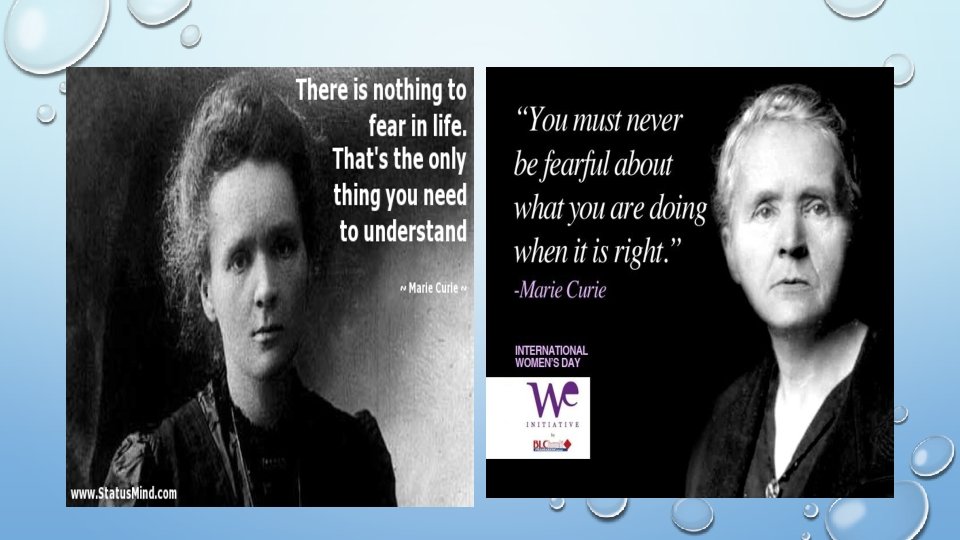 HER ACHIEVEMENT -ON JUNE 5, 1903, MARIE BECAME THE FIRST WOMAN TO RECEIVE A DOCTOR OF SCIENCE DEGREE FROM THE SORBONNE. -IN 1903, THE ACADEMY OF SCIENCE AT STOKHOLM, SWEDEN, AWARDED THE NOBEL PRIZE IN PHYSICS TO MARIE AND PIRRE AND HENRI BECQUEREL FOR THEIR DISCOVERIES IN RADIOACTIVITY.