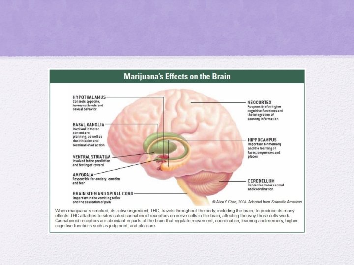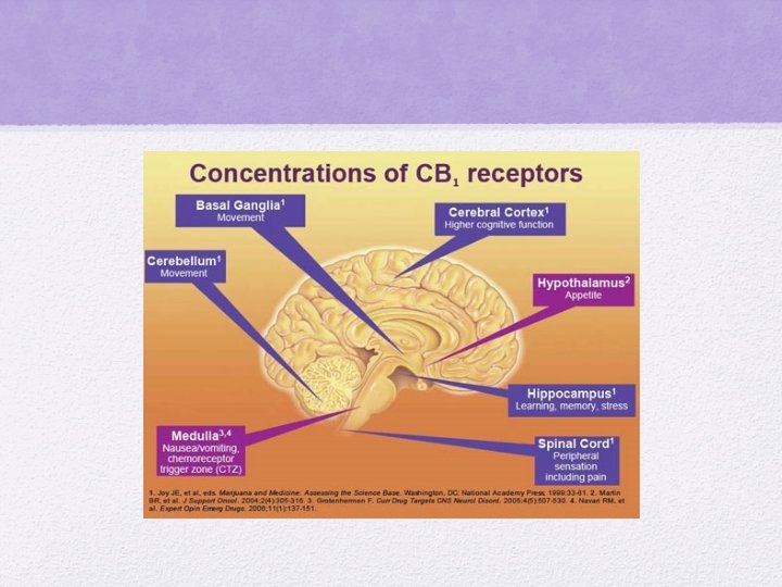 • CB 1 receptors are concentrated in the hippocampus, association cortices, basal ganglia, cerebellum, spinal cords, and peripheral nerves • CB 1 receptors are notably absent from the thalamus and brainstem