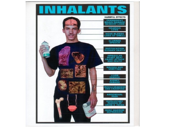 Inhalants • Inhalants are substances whose fumes are sniffed and inhaled to achieve a mind-altering effect. • Most inhalants go immediately to the brain and kill brain cells. • Inhalants