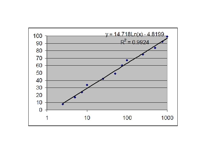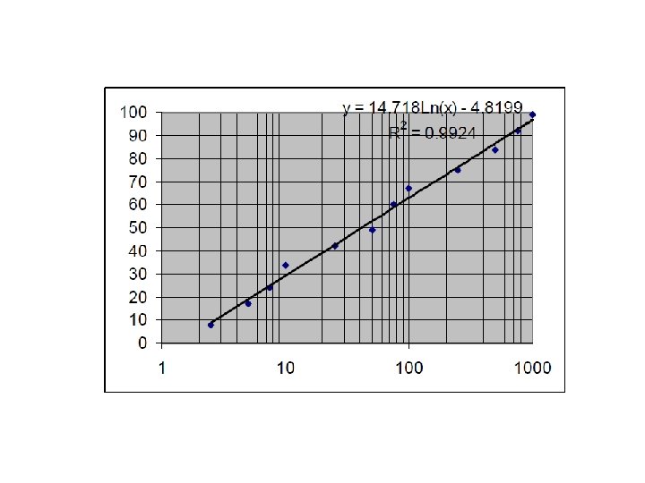 3. Adjust the Y-axis scale to be maximum 100, major 10, and minor 5. 4. Right click on the dots and select add trendline. 5. From Type window select Logarithmic. 6. From Options window check both Display equation on chart, and Display Rsquared value on chart boxes, and click Ok. 7. Delete the series box.