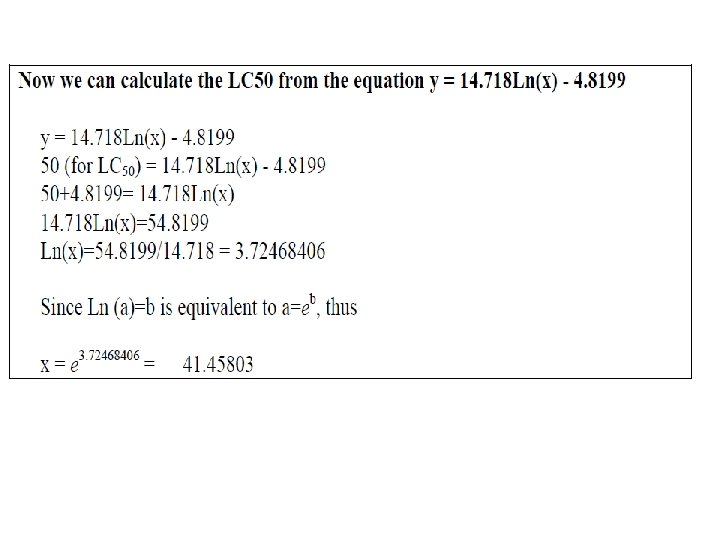 Calculation • Use the mortality data collected during the test to calculate a 96–h LC 50 value. The 24–, 48–, and 72–h values should also be calculated whenever there is sufficient mortality data to determine such values. • Calculate the mean number of deaths every 24 h at each concentration and write down your results in the following tables.