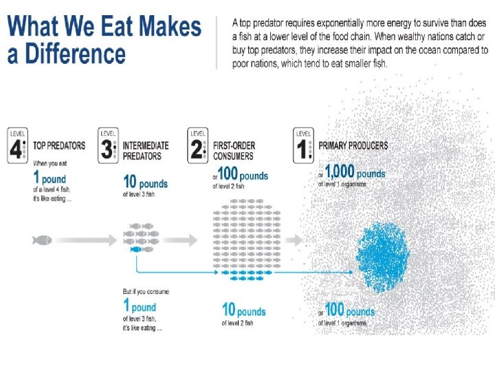 ENERGY TRANSFERS IN MARINE ENVIRONMENTS Primary producers usually outnumber consumers and at each succeeding step of the food chain the numbers decrease. The numerical relationship is called the pyramid of numbers. Some energy is lost as it passes to the next level because (a) consumers don't usually consume the entire organism (b) energy is used to capture food (c) organisms used energy during their metabolism (d) energy is lost as heat. Generally only 10% will pass on to the next level.