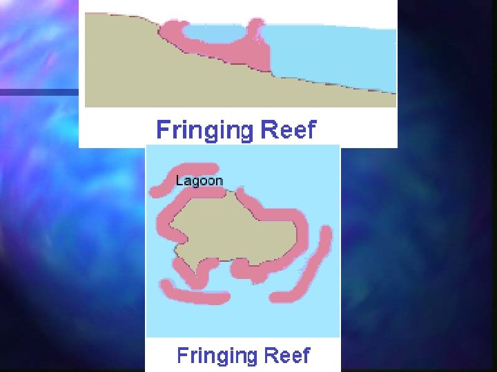 Fringing Reef n The most common type of coral reef. It is directly attached to the shore of a volcanic island or continent.