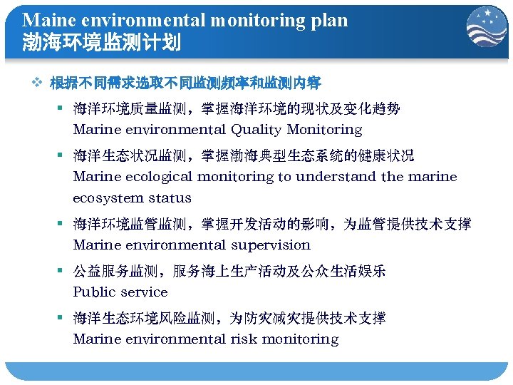 Maine environmental monitoring plan 渤海环境监测计划 v 5 types of monitoring tasks with 2082 stations 5大类监测任务,共布设 2082个站位 § § E. g. : Sea water monitoring 以海水监测为例: frequency: 4 times/year: Feb. May, August and October 监测频率: 4次/年,分别在 2月、5月、8月和10月开展。