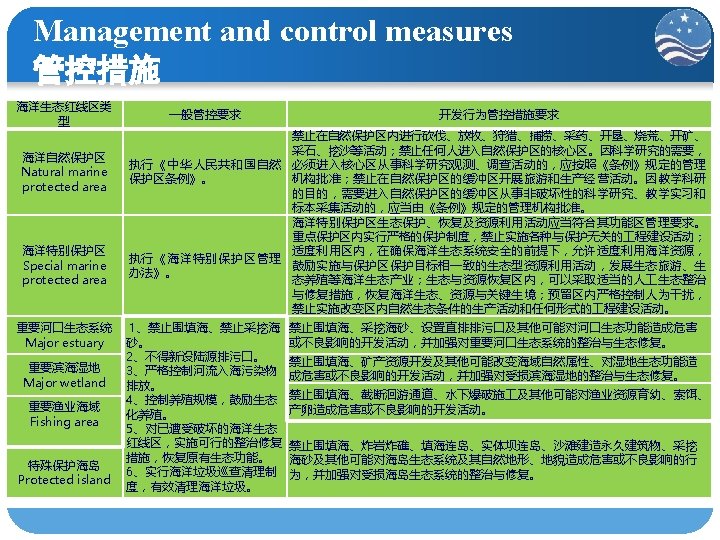 Marine ecological red-line areas 海洋生态红线区 Red line areas consist of Exploitation-prohibited Zone and Restricted Development Zones 红线区分为禁止开发区和限制开发区 Exploitationprohibited Zone 禁止开发区 including (1)the core area and buffer zone of natural MPAs, (2) the key protected areas and reserved areas of the special marine protected areas. 包括海洋自然保护区的 核心区和缓冲区 、海洋特别保护区的 重 点保护区和预留区。 Restricted Development Zones 限制开发区 Including (1)the experimental area of natural MPAs, (2)the moderate use area and the ecological and resource recovery area of special MPAs, (3)other important marine ecological function areas, ecological sensitive areas and ecologically fragile areas. 包括海洋自然保护区的实验区,海洋特别保护区的适度利用区 和生态与资源恢复区及除上述之外的重要海洋生态功能区、生 态敏感区和生态脆弱区。