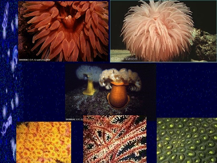 Phylum Cnidaria § Greek “stinging thread” § Body plan (Fig. 8 -7 b) § tissue level of construction (2 layers with mesoglea between) § 2 alternate body plans: § § polyp = sessile (anemone, corals) medusa = free-floating (jellyfish) § Many species possess both body plans in their life cycle (Fig. 8 -17, 8 -18) § Many species are colonial (polyp or medusa) (Fig. 8 -10 b, 8 -17)