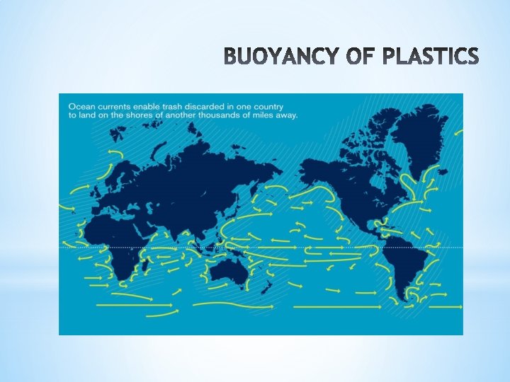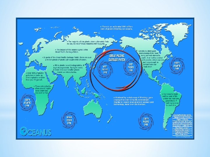 § 3 million tons of Debris § 90% OF DEBRIS IS PLASTIC §DISRUPTING OF OCEAN ECOSYSTEM DUE TO RAPID ACCUMULATIONOFPLASTICS BY CHANGING SPECIES HABITAT AND ENDAGERING MARINE LIFE. §NUMERICAL SIMULATIONSINDICATE THAT THE WASTE COULDTHUS REMAIN TRAPPED FROM TEN TO HUNDRED YEARS. § 600, 000 – 15, 000 square Kilometers